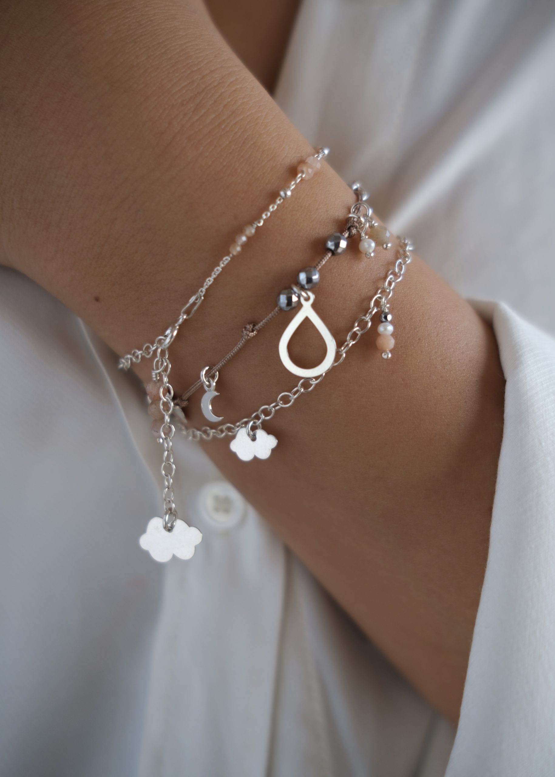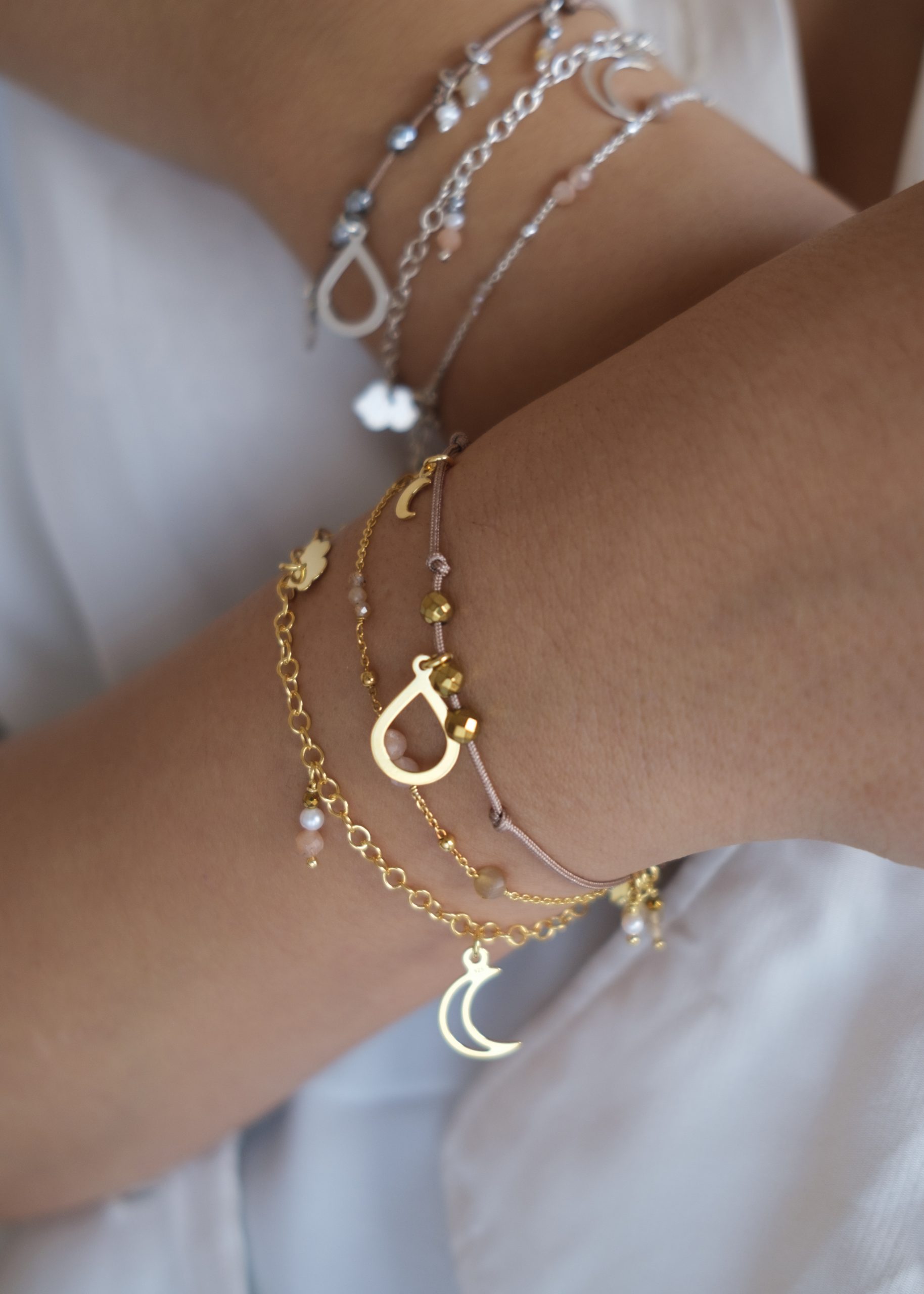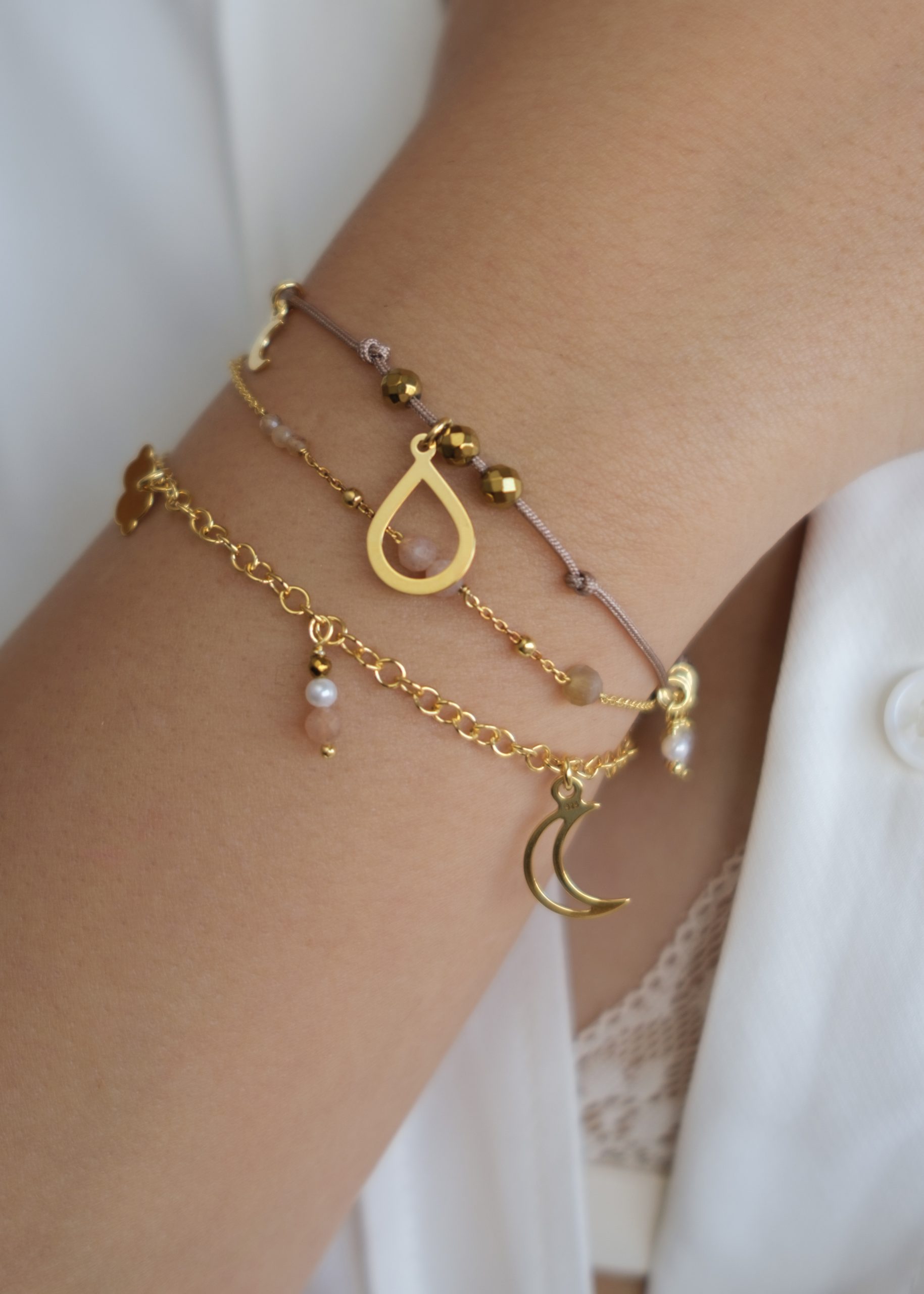 MATERIJAL: 925 Sterling Srebro Dovršavanje: 24k zlatna oplata KAMENI: multi mjesečev kamen, hematit, slatkovodni biser Duljina: 53.5 podesiva kopča i žica TEŽINA: 7,48 g