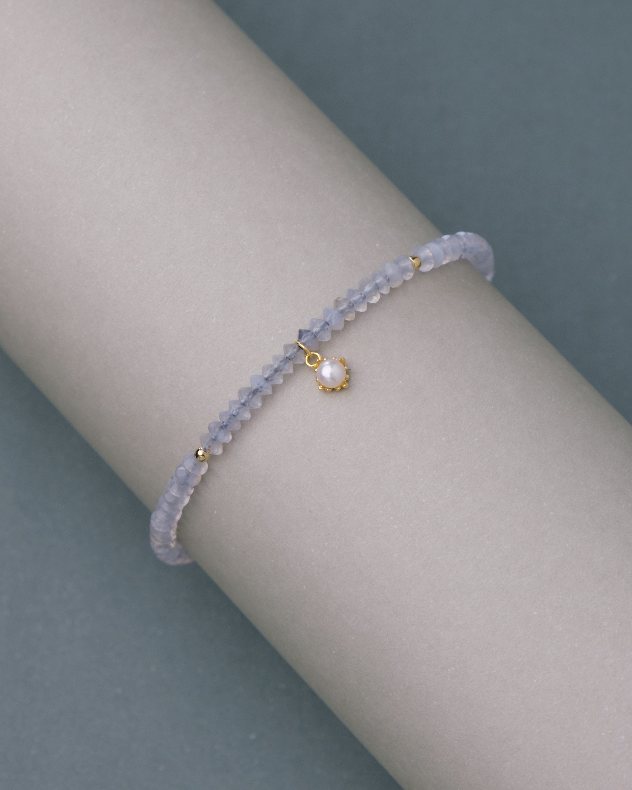 MATERIAL : 925 Sterling Silver FINISHING : 24k Gold plating/1 micron Gold plating STONES : river pearl, blue lace agathe WEIGHT : 2,05 g LENGTH : adjustable – macrame closure